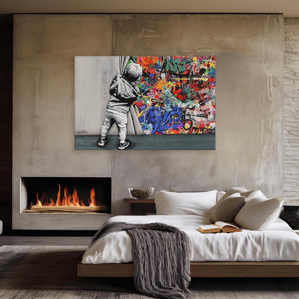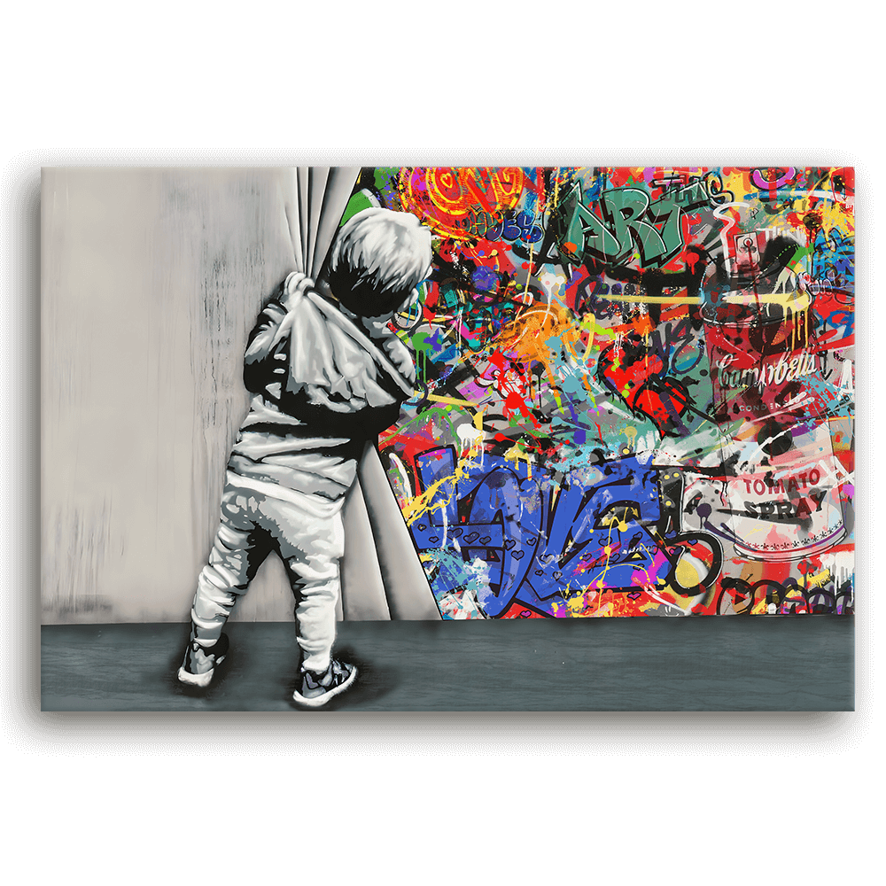 Hol dir Leinwandbild - Behind the curtain - Hinter dem Vorhang - Banksy inspired und bringe urbane Eleganz in dein Zuhause!