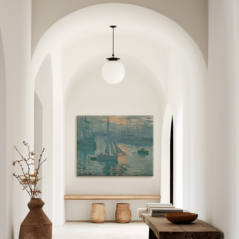 Das Leinwandbild Leinwandbild - Claude Monet - Sonnenaufgang - Sunrise (Marine)überzeugt mit matter Oberfläche und wird auf hochwertigem Canvas-Material (260 g/m²) im Eco-Solvent-Druck gefertigt. Der Druck in 1440 dpi sorgt für brillante Details und langlebige Farben mit hoher UV-Beständigkeit. Anschließend wird die Leinwand auf einen 2 cm starken Holzrahmen gespannt, die Ecken professionell umgeschlagen und das Leinwandbild Leinwandbild - Claude Monet - Sonnenaufgang - Sunrise (Marine) so fertig montiert geliefert – direkt zum Aufhängen ohne weiteres Zubehör.