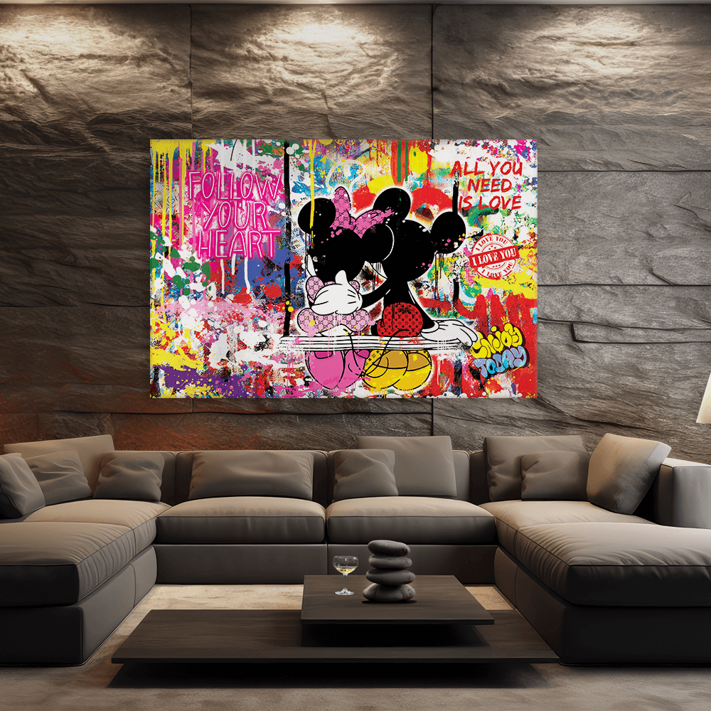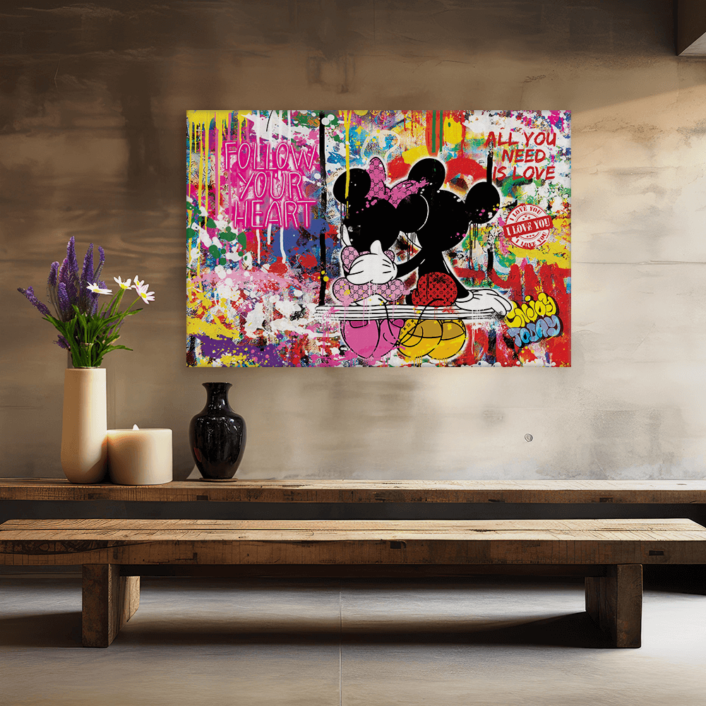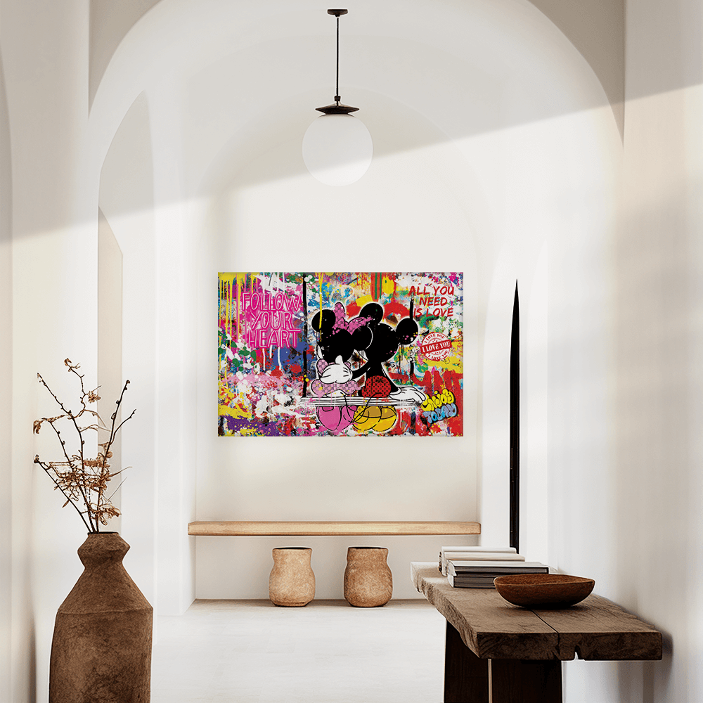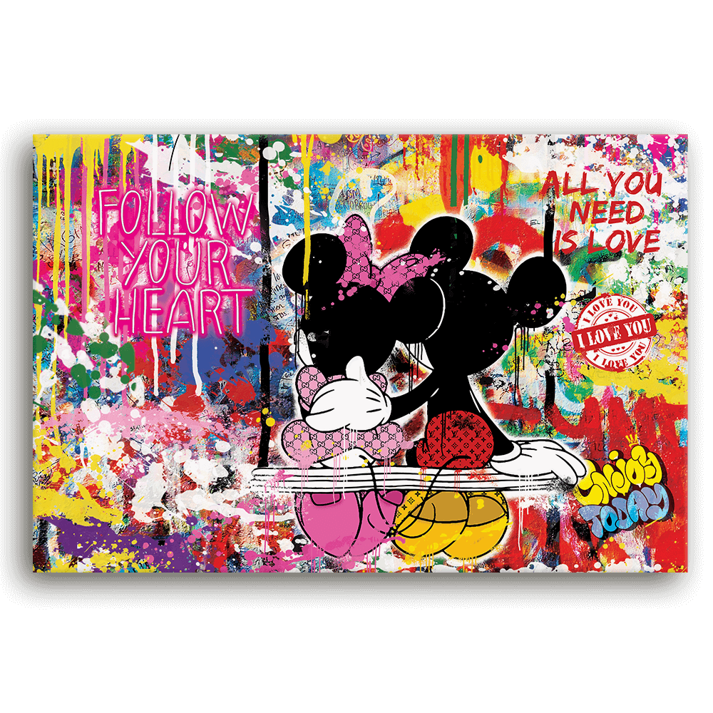 In einem Zeitalter, in dem die Gesellschaft zunehmend von Technologie und sozialen Medien dominiert wird, fordert die Aussage "Folge deinem Herzen" auf einem Leinwandbild auf einer tieferen Ebene zur Introspektion und zum Handeln gemäß persönlicher Werte und Überzeugungen auf. Die Verbindung dieser Botschaft mit der Darstellung von Charakteren, die an Mickey & Minnie erinnern, auf einem Gemälde, das Anklänge an Banksys Straßenkunst aufweist, verleiht der Botschaft eine zusätzliche Schicht. Das Leinwandbild erinnert daran, dass trotz der Herausforderungen des modernen Lebens und der Flut von Informationen und Einflüssen, die auf den Einzelnen einwirken, das Folgen des eigenen Herzens und der eigenen Leidenschaft der Schlüssel zu einem erfüllten Leben bleibt.