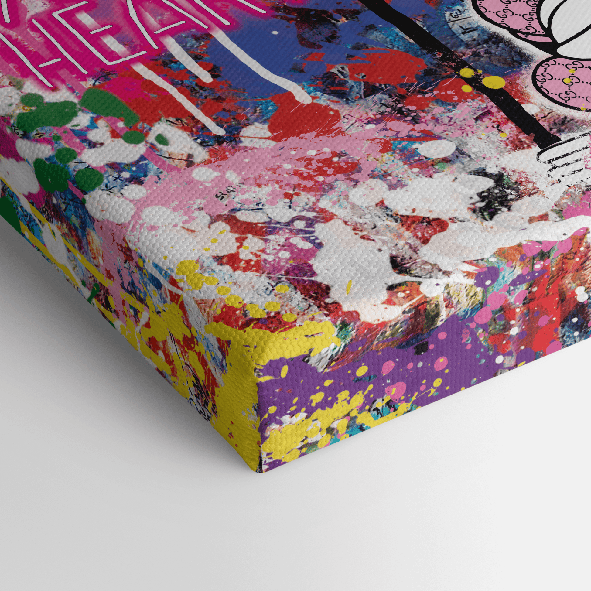 Die vielfältige Farbkomposition des Leinwandbildes vermittelt eine Botschaft, die sowohl lebendig als auch nachdenklich ist. Die Verwendung von kräftigen, dynamischen Farben in Kombination mit den sanften Farbverläufen schafft ein visuelles Spektakel auf dem Gemälde, das sowohl die Energie als auch die Komplexität der Themen einfängt, die das Kunstwerk zu adressieren scheint. Das Leinwandbild mit seinen Farben ist nicht nur ein ästhetisches Mittel, sondern trägt auch eine symbolische Bedeutung und kann Stimmungen und Gefühle auslösen. In diesem Fall könnten die lebhaften Farben auf dem Bild Optimismus und Lebensfreude repräsentieren, während die subtileren Töne vielleicht die Komplexität und die Nuancen des Lebens symbolisieren. Dieses Zusammenspiel von Farben auf dem Leinwandbild kann gesehen werden als ein Spiegelbild der vielschichtigen Natur der menschlichen Erfahrung und als eine Feier der kulturellen Vielfalt, die durch die Verwendung von Symbolen und Stilen, die an Mickey & Minnie und Banksy erinnern, noch verstärkt wird.