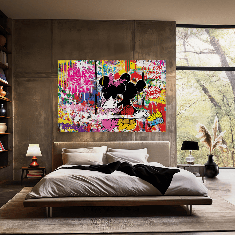 Banksy, als Synonym für subversive Street Art, hinterfragt oft die bestehenden gesellschaftlichen Normen und bietet durch seine anonymen Werke, oft reproduziert als Leinwandbilder, eine kritische Perspektive auf die Welt. Die Einarbeitung von Figuren, die an Mickey & Minnie erinnern, in einen Kontext, der Banksys Stil ähnelt, als Leinwanddruck verstärkt die Diskussion um Authentizität, Massenkultur und Kommerzialisierung der Kunst. Banksys Werke als Leinwandbilder, die häufig die Form von öffentlichen Interventionen annehmen, fungieren als kulturelle Stolpersteine, die Passanten zum Innehalten und Nachdenken bewegen. Die Aneignung solcher ikonischen Charaktere durch die Street Art als Leinwandbild kann als Versuch interpretiert werden, die Macht der visuellen Kommunikation zu nutzen, um die Betrachter zu einer kritischen Reflexion ihrer Umwelt und des Status quo zu bewegen.
