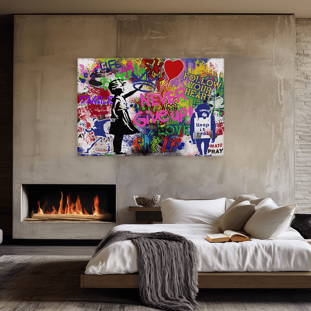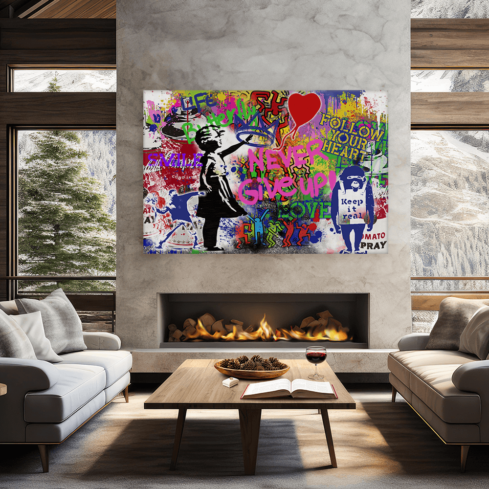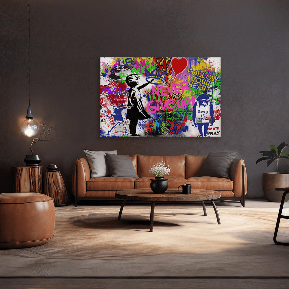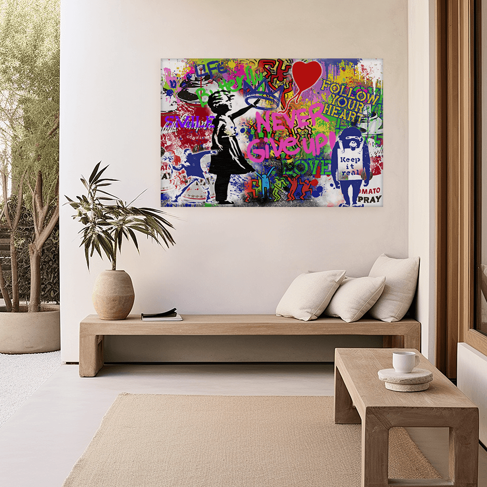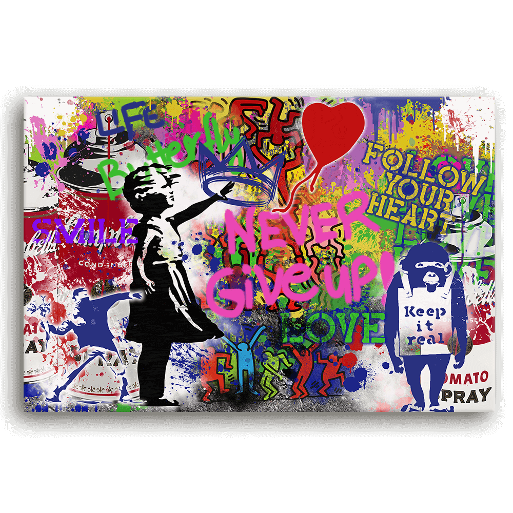 Hol dir Leinwandbild - Never give up - Banksy inspired und bringe urbane Eleganz in dein Zuhause!